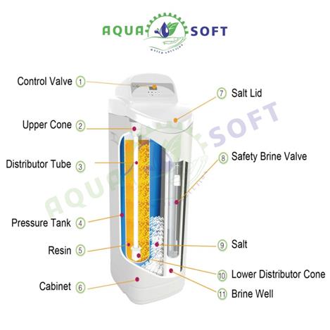 - Salt Tank or Cabinet– holds the salt that makes the brine solution used to regenerate the softening resin