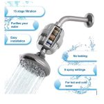 The shower filter uses a multi-stage filtration process to remove chlorine, sediments, and other impurities effectively.